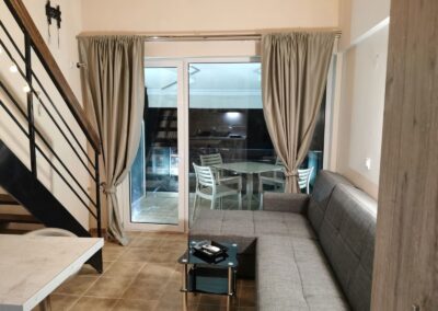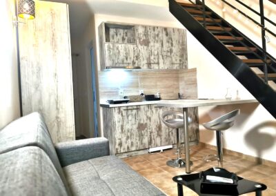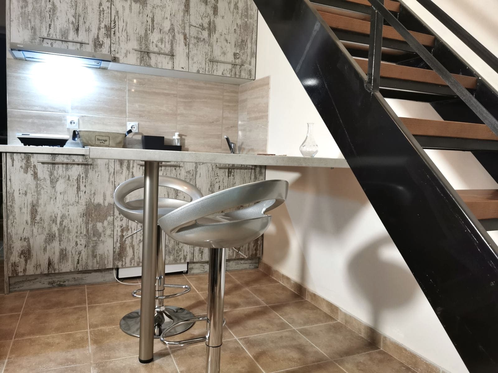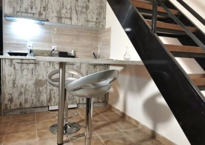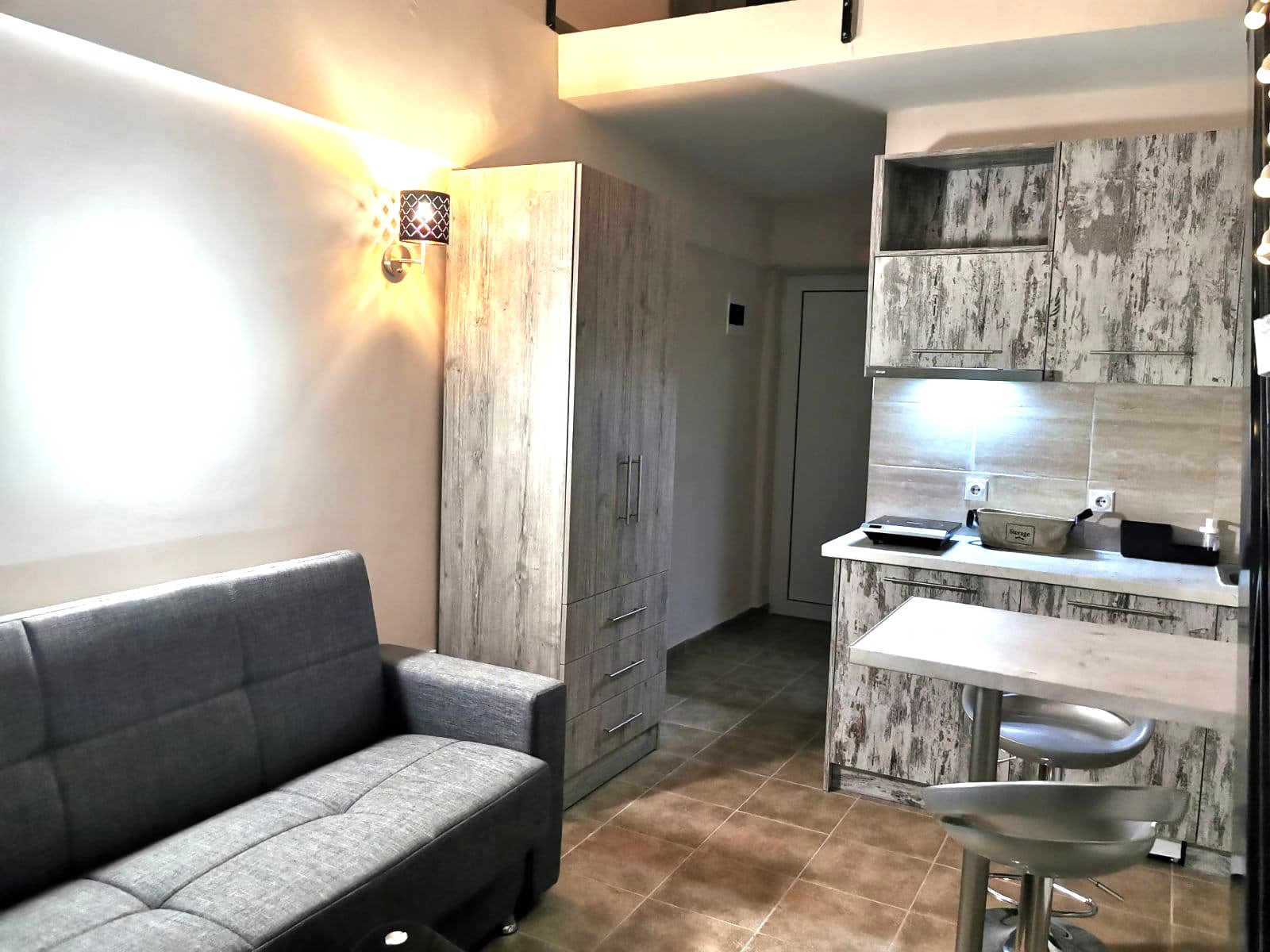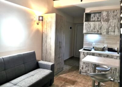 1/4 studio sa galerijom – na donjem nivou velika ugaona garnitura koja se razvlači (za dvoje odraslih ili dece), čajna kuhinja i kupatilo, a na gornjem nivou galerija do koje vode stepenice francuski ležaj.