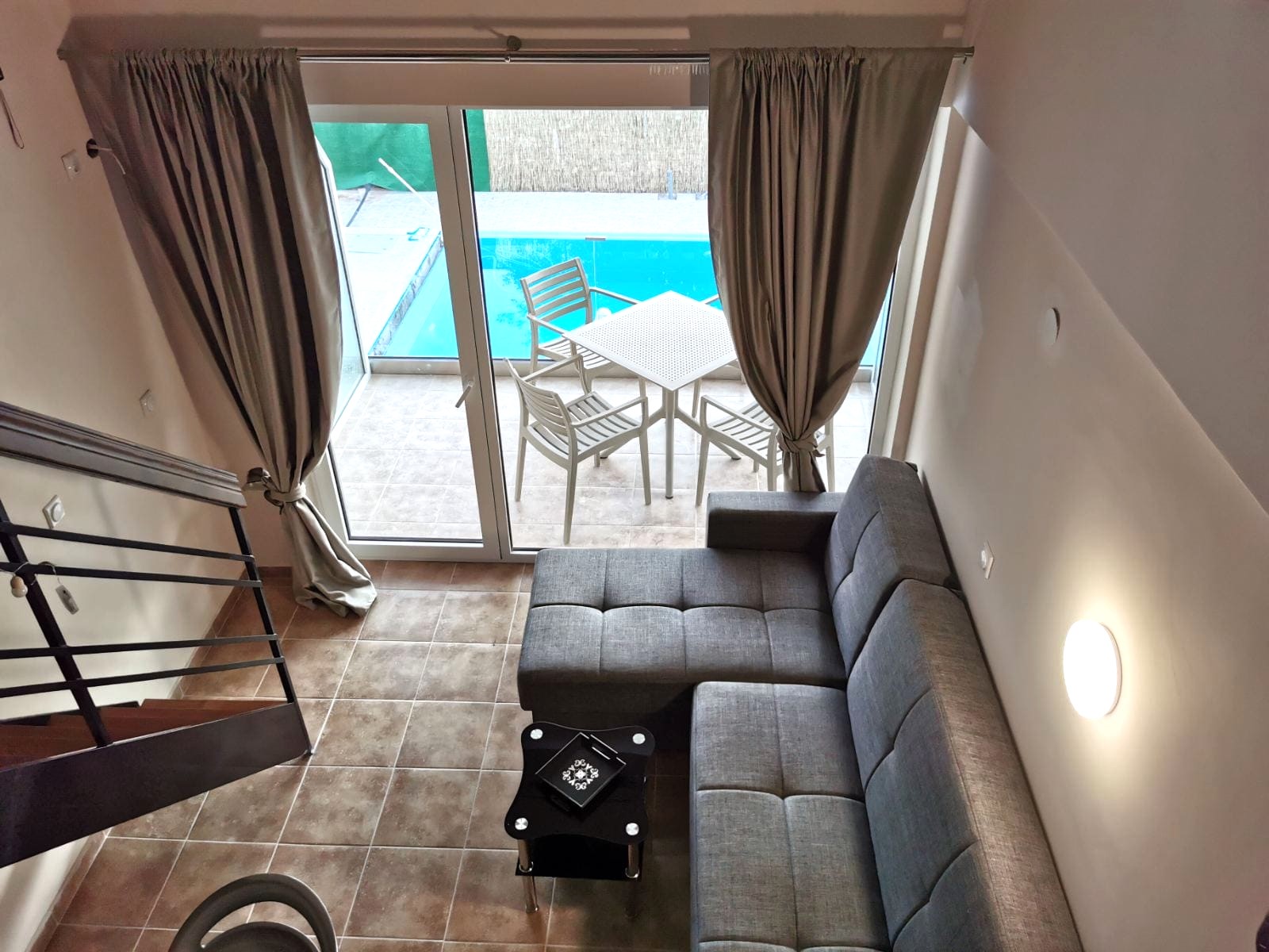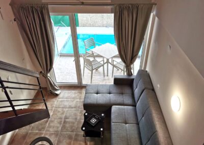 Vila raspolaže dvokrevetnim i trokrevetnim studijima koji se nalaze u prizemlju kao i četvorokrevetnim studijima sa galerijom koji su na 1. spratu. U studijima sa galerijom, na donjem nivou je velika ugaona garnitura koja se razvlači (za dvoje odraslih ili dece), čajna kuhinja i kupatilo, a na gornjem galerija do koje vode stepenice se nalazi francuski ležaj. Svi studiji imaju pogled na bazen pored koga postoji ograničeni broj ležaljki i suncobrana.